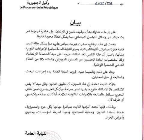 أعلنت النيابة العامة اليوم انها بالفعل بأت إجراءات البحث والمتابعة بحق نائبين في البرلمان، على خلفية بث مباشر على وسائل التواصل الاجتماعي اعتبرت أنه تضمن “أفعالاً مجرّمة قانوناً”.