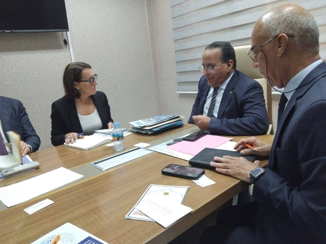 عقد الأمين العام لوزارة لوزارة الشؤون الاقتصادية والتنمية السيد / يعقوب ولد أحمد عيشه اليوم بمقر الوزارة، اجتماعا رفيع المستوى مع بعثة من المكتب الدولي لمكافحة المخدرات والجريمة ، وذلك لبحث سبل تعزيز التعاون الأمني والاستراتيجي المشترك.