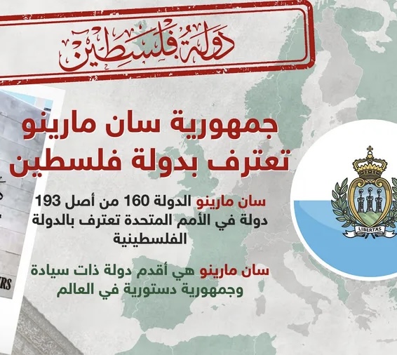 رحبت وزارة الخارجية الفلسطينية، اليوم الأحد، باعتراف جمهورية سان مارينو بدولة فلسطين، واعتبرته قرارا شجاعا ينسجم مع القانون الدولي وقرارات الامم المتحدة ويدعم الجهود المبذولة لتحقيق السلام وتطبيق حل الدولتين.