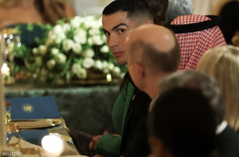 نشرت وكالة "رويترز" للأنباء صورة قالت إنها لنجم كرة القدم البرتغالي كريستيانو رونالدو في حفل العشاء الذي أقامه الرئيس الأميركي دونالد ترامب خلال استضافته ولي العهد السعودي الأمير محمد بن سلمان الذي يزور واشنطن، على مأدب