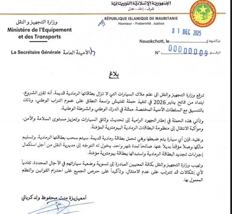 أعلنت وزارة التجهيز والنقل ان السيارات التي لا تزال بطاقاتها الرمادية قديمة، قد تقرّر الشروع، ابتداءً من فاتح يناير 2026 في تنفيذ حملة تفتيش واسعة النطاق على عموم التراب الوطني، وذلك بالتنسيق مع السلطات الأمنية المختصة،